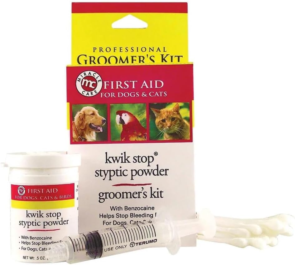 Fast-acting Kwik Stop Styptic Powder, Gel and/or Pads are used to treat minor bleeding caused while clipping nails, trimming beaks, declawing and docking. Now contains mild ingredients to block pain while stopping bleeding. Simply apply with pressure to the affected area. For use on dogs, cats, ferrets, and birds. Powder is available in 1/2 ounce, 1.5 once or 6 ounce jars, Gel is available in a 4 ounce bottle. Pads are available in a 90 pad jar. Gel swabs come 3 to a box. Also available in a groomer's kit which contains a 1/2 oz jar of Kwik Stop Powder, an applicator, and cotton swabs.